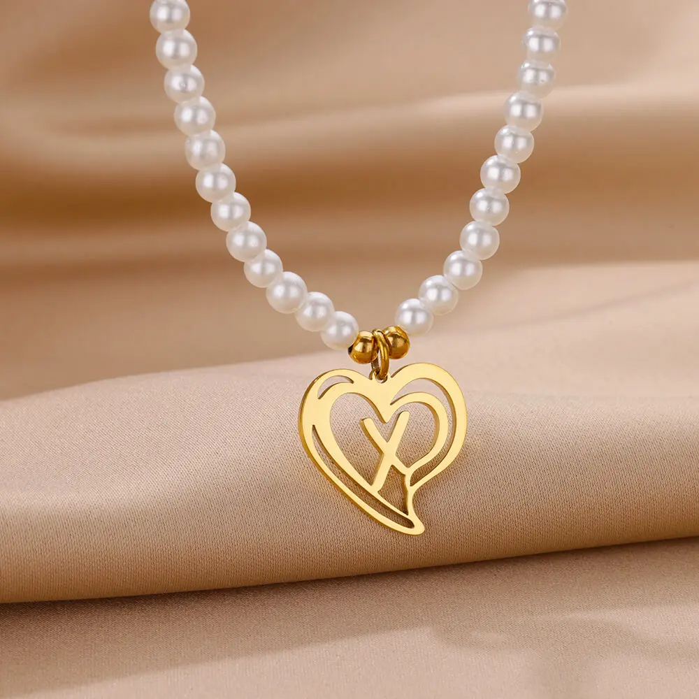 Heart A-Z Letter Pearl Necklaces For Women Stainless Steel Initial Pearl Pendant Necklace Birthday Wedding Jewelry X-45cm – Sumsfashion